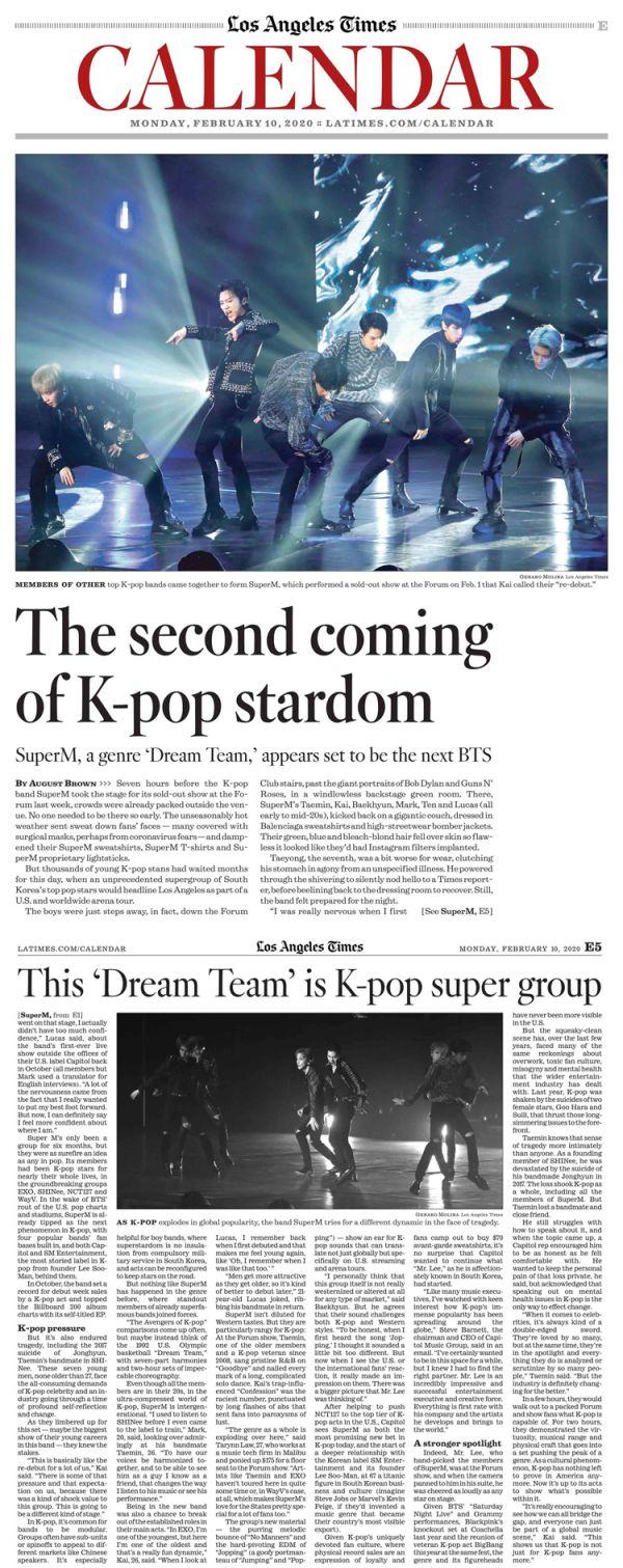 지난 10일 미국 주요 언론 ‘LA Times’의 엔터테인먼트 섹션에는 LA 더 포럼에서 열린 SuperM의 공연을 조명하는 내용이 커버 기사로 게재되어 이번 공연에 대한 현지의 뜨거운 관심을 실감케 했다.