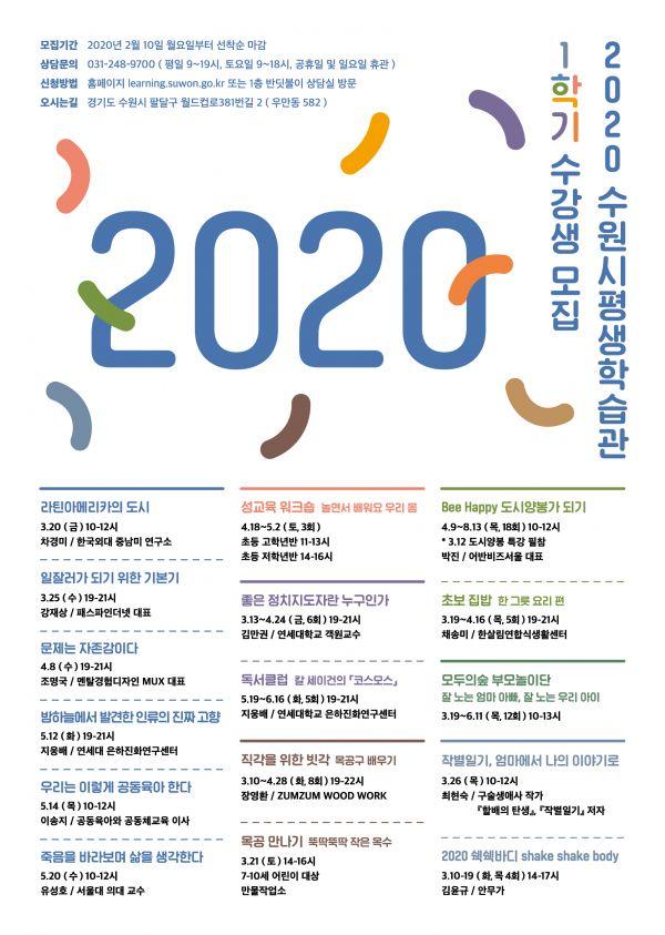 수원시평생학습관이 오는 17일부터 ‘2020년 1학기 강좌’에 참여할 수강생을 모집한다.