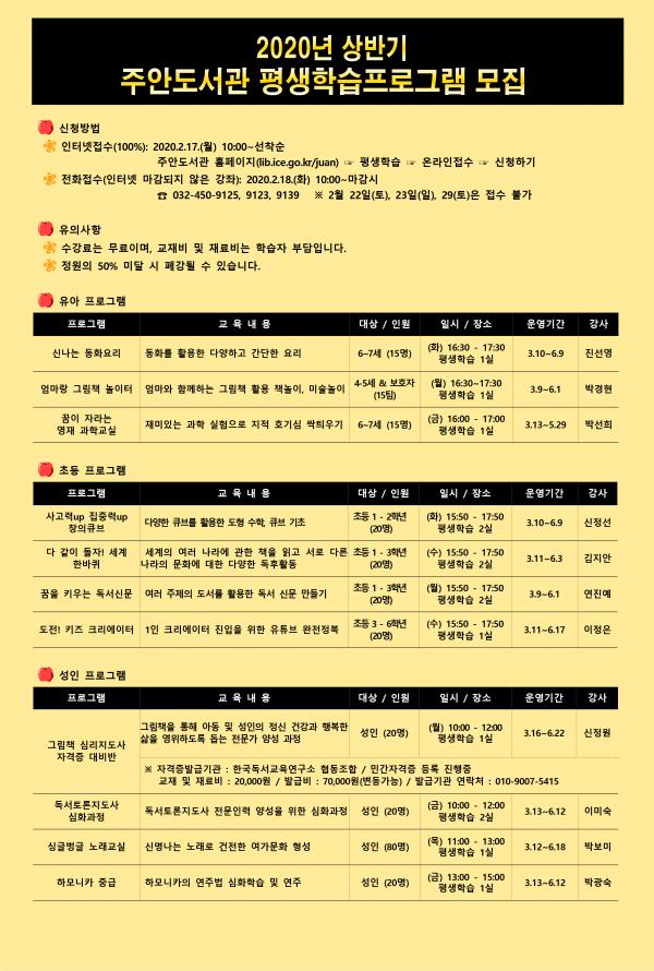 인천광역시교육청주안도서관에서는 ‘상반기 평생학습프로그램’ 수강생을 오는 17일부터 모집한다.
