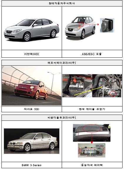 첫째, 현대자동차㈜에서 제작, 판매한 아반떼 등 2개 차종 49만1102대는 일부 노후 차량의 ABS/ESC 모듈 전원부에 오일 또는 수분 등의 이물질이 유입되어 내부합선으로 인한 화재 발생 가능성이 있어 시정조치에 들어간다.