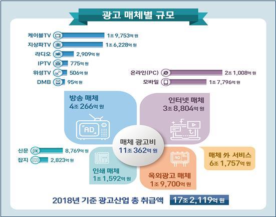 매체 광고비 11조 362억원 중 방송매체[지상파 텔레비전, 라디오, 케이블 텔레비전, 아이피텔레비전, 위성 텔레비전, 디엠비] 취급액은 4조 266억원으로 가장 큰 비중을 차지하고 있으며 특히 케이블 텔레비전 광고 취급액은 1조 9753억원으로 매년 하락세를 보이고 있는 지상파 텔레비전 광고 취급액을 2017년 기준 처음 추월한 이후 계속 격차를 넓혀가고 있다.