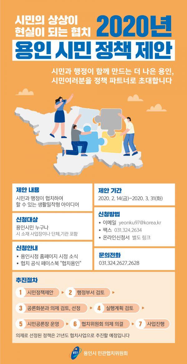 용인시민이면 누구나 시민들을 위한 생활밀착형 사업이나 의제를 시 홈페이지나 페이스북 ‘용인 협치’를 통해 제안할 수 있다.
