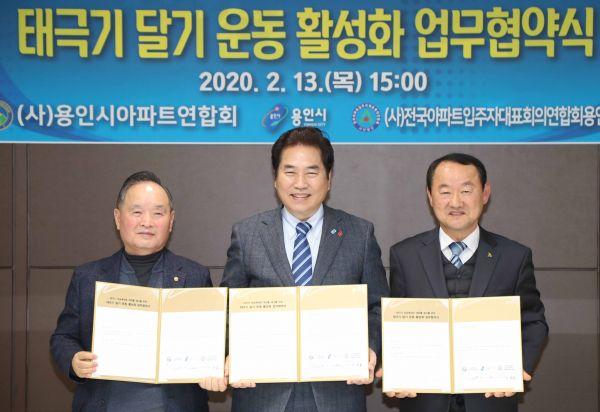 용인시는 13일 시장실에서 용인시아파트연합회, 전국아파트입주자대표회의연합회 용인시지회 등 2곳과 태극기 달기 운동 활성화 업무 협약을 맺었다.