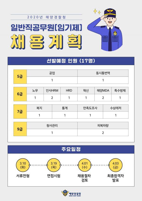 해양경찰 조직역량 강화를 위한 우수인재 선발2월 12일부터 2월 26까지 원서 접수 모집 분야로는 5급 상당 연구관 임기제 1명, 5급 임기제 1명, 6급 임기제 8명, 7급 임기제 4명, 9급 임기제 3명이다.