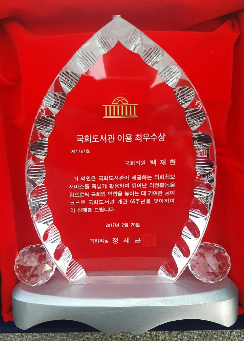 국회도서관은 도서관 이용실적을 네 부문(의회·법률정보 회답, 단행본 대출, 의원 방문, 전자도서관 이용)으로 나눠 부문당 2명씩 모두 8명의 ‘국회도서관 이용 최우수 국회의원’을 선정했는데, 백재현 의원은 2013년부터 2015년까지 3년간 ‘단행본 대출 이용’ 분야 최우수 의원으로 선정된 것에 이어 2016년에는 ‘의회·법률정보 회답 이용’ 부문 최우수 의원으로 선정되었다.
