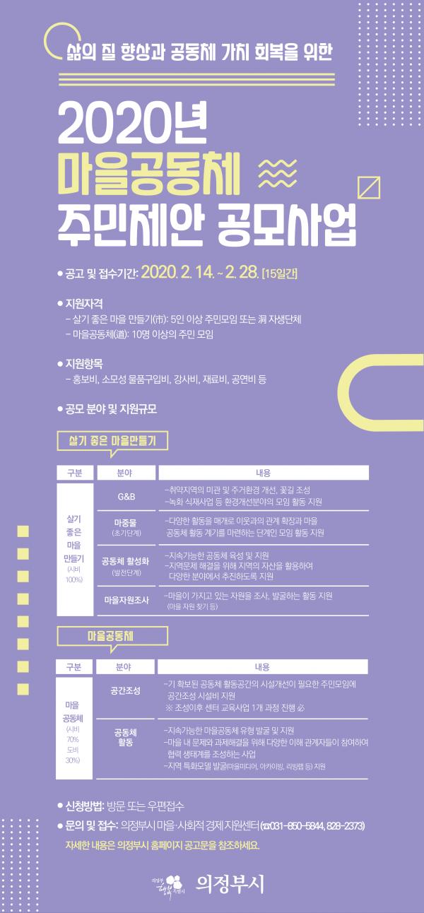 의정부시는 14일부터 오는 28일까지 삶의 질 향상과 공동체 가치회복을 위한 2020년 마을공동체 주민제안 공모사업을 접수한다.
