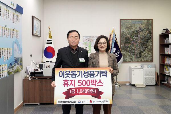 ㈔한마음장애인복지회가 어려운 이웃에게 전달해 달라며 14일 성남시에 1040만원 상당의 휴지 500상자를 기탁했다.