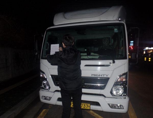 대형화물차량이 차고지 외 밤샘 주차를 상습적으로 해 민원 발생이 잦은 용현산업단지 일원, 금오119안전센터 주변, 용민로 61번길 등에서 불법 주정차된 대형 화물차량 18대에 지정된 차고지에 주차할 수 있도록 안내하고 차후 적발 시 관련 규정에 의거 행정처분 조치됨을 안내하는 경고장을 부착했다.