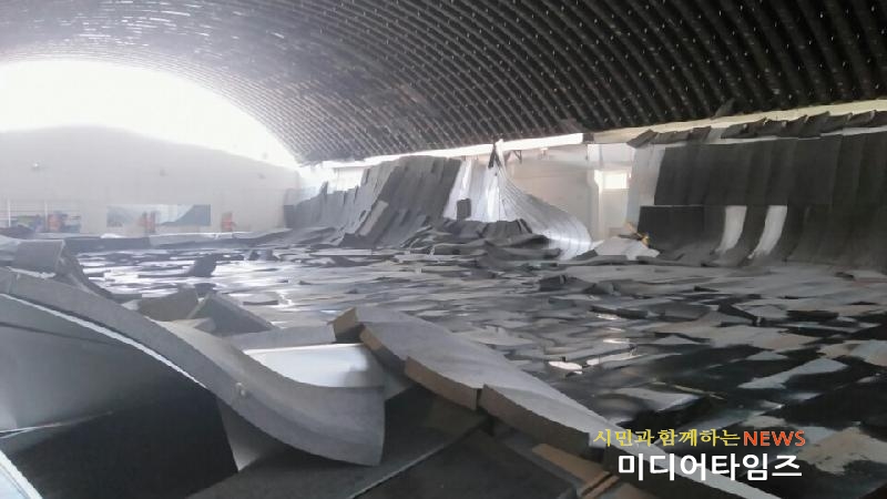 | 20일 오전, 인천시 학생수영장 천장이 무너져 있는 현장 사진.<사진/ⓒ미디어타임즈> |