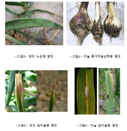 양파 잎에 발생하는 노균병은 겨울나기 후 병에 걸린 부위가 노랗게 변하고 잎 표면에 회색 포자와 균사를 형성한다.
