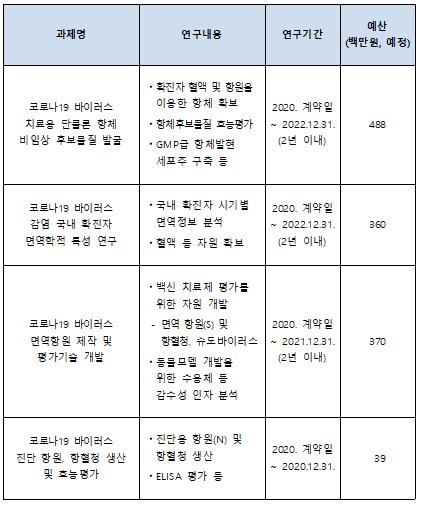 이번 연구는 코로나19 바이러스 확진자의 혈액 자원을 확보해 치료제 개발에 필요한 항체후보물질을 발굴 및 백신 개발을 위해 확진자 대상 면역학적 특성, 평가기술 개발 등을 연구하는 것이다.