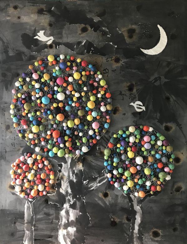 작가는 작은 한지 작업들을 화면에 조화롭게 배치해 새로운 세계를 만든다.