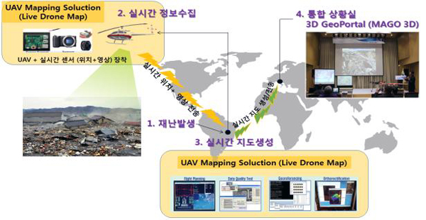 라이브 드론맵 기술은 재난 상황이 발생하거나 평화유지를 위한 군사 활동 등 접근이 불가능한 지역에 드론을 띄워 지도를 구축하고 이를 실시간으로 확인할 수 있는 기술로서, 현장에 띄워진 드론을 통해 공간정보를 취득→전송→자동 매핑해 멀리 떨어진 곳에서도 실시간으로 현장을 확인할 수 있게 해 준다.