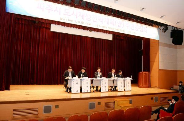 공청회는 용역사의 제안 설명 후 장윤배 경기연구원박사, 안명규 파주시의회 부의장, 이훈 신한대학교수, 김우경 파주시도시재생지원센터장, 김선철 명지대학교수가 참여해 토론이 진행됐으며 이후 주민들의 질의·답변 과정을 통한 의견 수렴도 진행됐다.