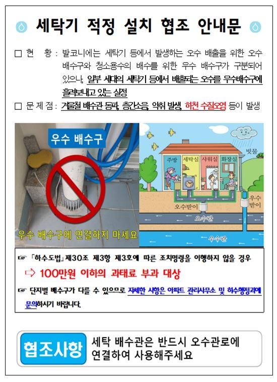 서중배 하수행정과장은 “시민들이 오수와 우수의 구분에 대한 정보가 부족해 잘못된 세탁기 설치 사례가 발생하고 있는 만큼 적정 설치에 대한 홍보를 강화한다”고 설명하고 공동주택관리사무소에 세탁기 적정설치에 대해 홍보 해주기를 협조 요청했다.