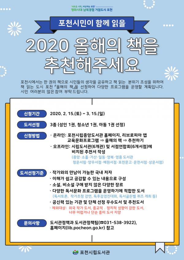 포천시립도서관에서는 한 권의 책으로 시민들의 생각을 공유할 수 있는 포천시민이 함께 읽을‘2020 올해의 책’후보도서를 오는 3월 15일까지 시민들로부터 추천받는다.