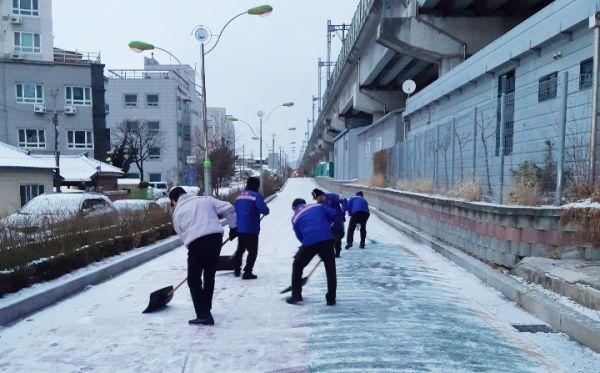 방재단원 30여명이 참여해 전철하부 산책로 제설작업에 구슬땀