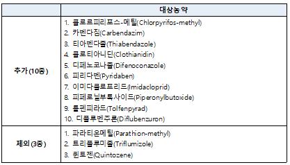 최초 수입식품에 적용하는 농약 검사항목은 58종으로 최근 5년간 부적합이 없으면서 검출이력이 5회 미만인 퀸토젠 등 3종의 농약은 제외하고 부적합 발생 및 검출빈도가 높은 카벤다짐, 톨펜피라드 등 10종의 농약은 추가해 총 65종의 농약을 수입단계에서 집중 검사한다.