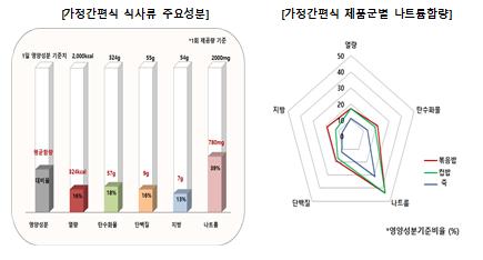 시중에 유통 중인 가정간편식 식사류는 1회 제공량 당 평균 열량, 탄수화물, 단백질 등이 1일 영양성분기준치에 비해 모두 낮은 것으로 조사되어 한 끼 식사대용으로는 부족한다.