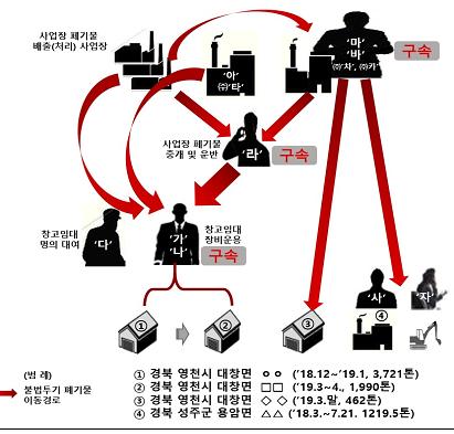 또한 '마'와 '바'는 법인인 ‘차’의 명의로 경북 영천시에 창고를 빌려 462톤을 무단 투기했다.