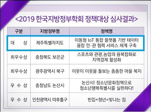 제주특별자치도는 지난 14일 한국지방정부학회 주관한‘지방정부 정책대상’에서 ‘이동형 IoT 통합플랫폼 기반 데이터 융합 민·관 협업 서비스 체계 구축’ 정책사례로 ‘대상’을 수상했다고 밝혔다.