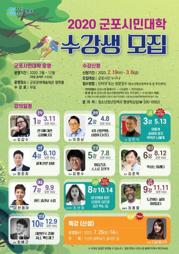 시는 오는 3월 개강, 연말까지 매월 개최될 ‘2020 군포시민대학’에 더 많은 시민이 참여할 수 있도록 운영 방식에 변화를 줬다고 19일 밝혔다.