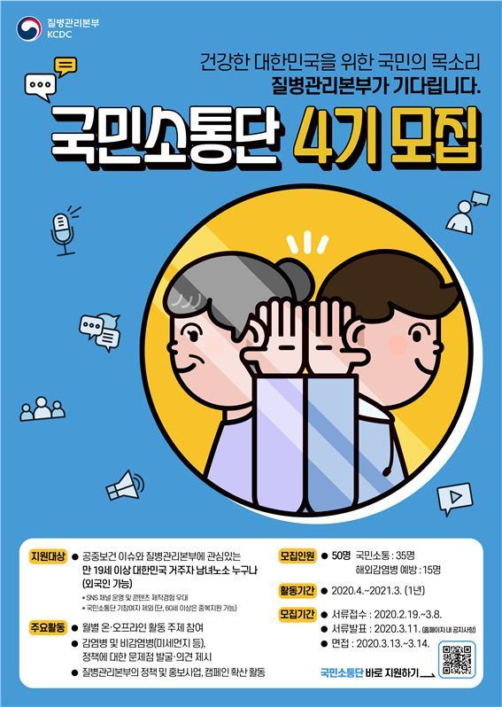 이번에 모집하는 질병관리본부 국민소통단 4기는 질병예방과 건강에 관심 있는 만 19세 이상 대한민국 거주자 누구나 신청할 수 있으며 선발된 소통단은 내년 3월까지 활동할 예정으로 국내 거주 외국인도 신청 가능하다.