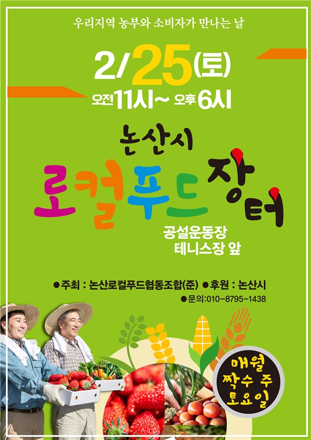 오는 25일부터 시작되는 로컬푸드 장터는 매월 짝수 주 토요일 오전 11시부터 오후 6시까지 논산공설운동장 테니스장 앞에서 50여 농가가 참여한다.