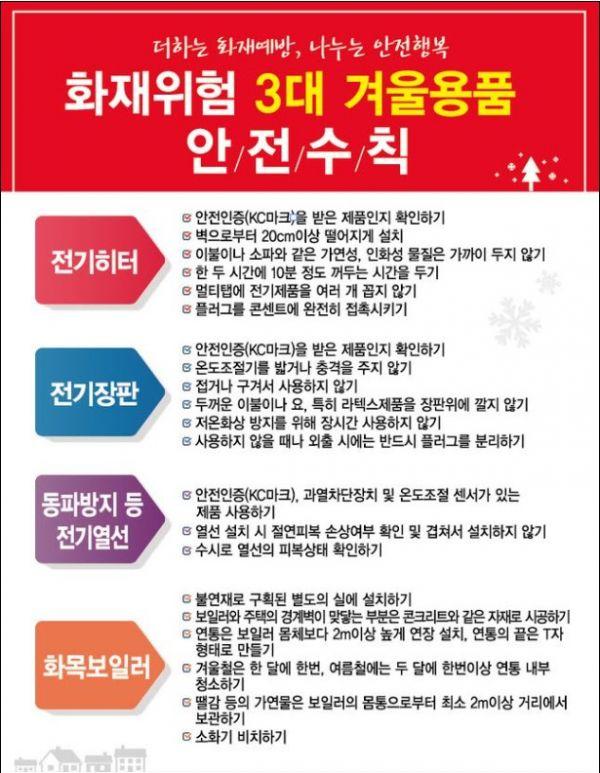 화재로부터 3대 겨울용품을 안전하게 사용하기 위해선 장시간 사용하지 않을 경우 전원 플러그 뽑기, 문어발식 전기 콘센트 사용 금지, 기기자체 안전장치 정상 작동여부 확인, 화목보일러 주변 가연성 물질 제거 및 소화기 비치 등을 실천해야 한다.