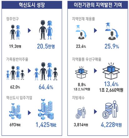 정주인구는 20.5만명으로 ’18년 말 대비 1.2만명이 증가했고 총 1425개의 기업이 혁신도시에 둥지를 틀어 ‘18년 말 대비 두 배 이상 늘어났다.