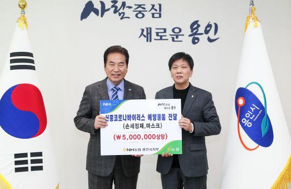 용인시는 지난 18일 이의도 농협중앙회 용인시지부장이 백군기 시장실을 방문해 코로나19 예방을 위해 사용해 달라며 500만원 상당의 손소독제 300개와 마스크 2000매를 기탁했다고 밝혔다.