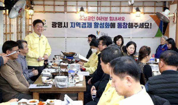 박승원 광명시장은 시민안전대책본부 회의가 끝난 후 광명사랑화폐로 새마을시장에서 물건을 구입하며 코로나19로 시름에 빠져있는 상인들을 격려했다.