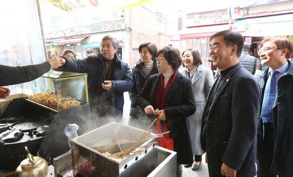 송한준 의장을 비롯한 경기도의회 비상대책본부 의원들이 수원지역 전통시장에서 다양한 먹거리를 구입하며 신종 코로나바이러스 감염증 여파로 얼어붙은 지역경제 살리기에 나섰다.
