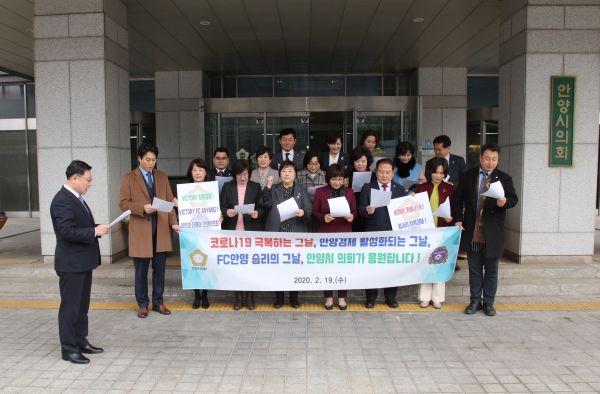 안양시의회가 19일 제253회 임시회 2차 본회의에 앞서 시의회 현관 앞에서 지역경제 활성화 및 FC안양 홍보를 위한 성명을 발표했다.