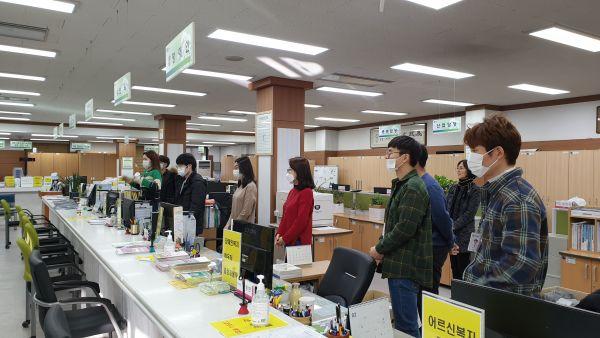 19일 강릉시 성덕동주민센터에서는 코로나19 예방을 위해 모든 직원들이 마스크를 착용한 가운데 아침 친절교육을 실시하고 있다.