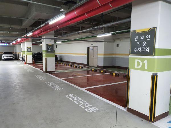 이에 복합청사 1층 지상주차장 34면과 지하주차장 출입구 방면 주차장 15면에 에폭시 도장공사 및 민원인전용 주차안내 표지판을 설치하고 민원인전용 주차장을 조성했다.