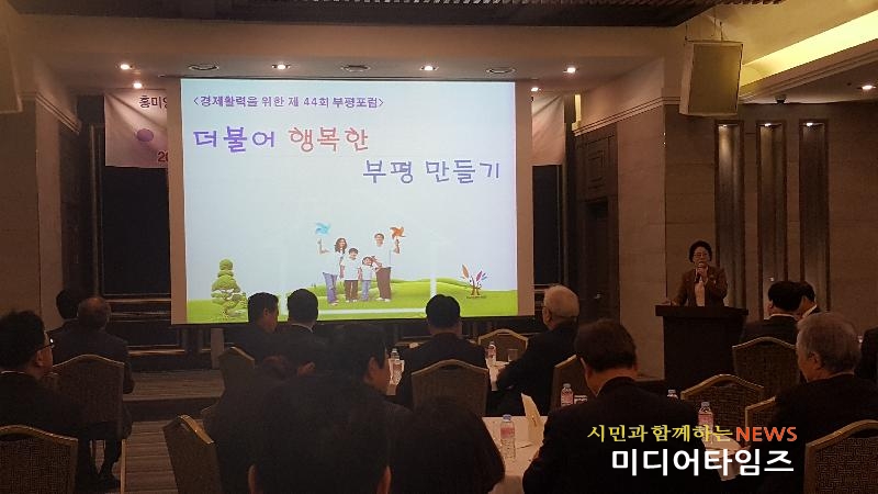 [미디어타임즈=문상수 기자] 홍미영 부평구청장은 22일 부평관광호텔 컨벤션센터에서 열린 ‘제44회 부평포럼’에 강사로 나서 ‘더불어 행복한 부평 만들기’라는 주제로 특강을 했다.부평포럼은 인천상공회의소(회장 이강신) 주관으로 관내 기업인들의 발전 및 상생도모를 위해 강사를 초빙, 분기별로 강연을 갖는 모임이다.이날 행사에는 인천상공회의소 회장, 부평구경영자협의 회장, 부평구 중소기업협의 회장 등 기업인 및 관계자 100여명이 참석했다.홍미영 구청장은 “급변하는 사회 환경과 세계적으로 침체된 경제상황 속에서도 지역경제를 위해 애쓰시는 기업인 여러분께 감사드린다”며 “우리 부평구가 보다 정의롭고 고르게 잘 살 수 있는 도시, 모두가 더불어 행복한 도시로 발전하기 위한 비전과 성과를 많은 기업인들에게 알리게 돼 매우 기쁘게 생각한다”고 말했다.유수동 인천상공회의소 사무국장은 “앞으로도 더불어 행복한 도시 부평 만들기에 기업인들과 함께 적극 동참해 나가겠다”고 밝혔다.