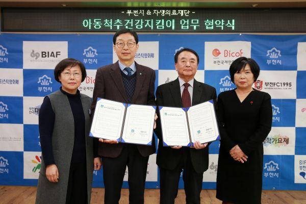 부천시가 지난 19일 시청 만남실에서 자생의료재단과 아동척추건강지킴이 사업 업무 협약을 체결했다.
