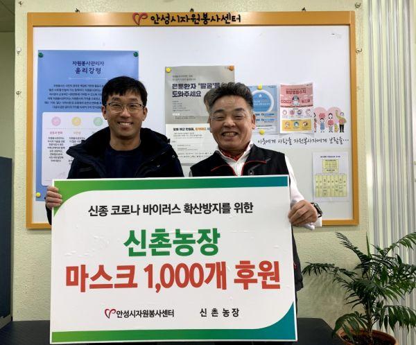 안성시 신촌농장은 지난 19일 지역사회 어려운 이웃들의 코로나 19 감염예방을 위해 써달라며 마스크 1,000개를 안성시자원봉사센터에 전달했다.