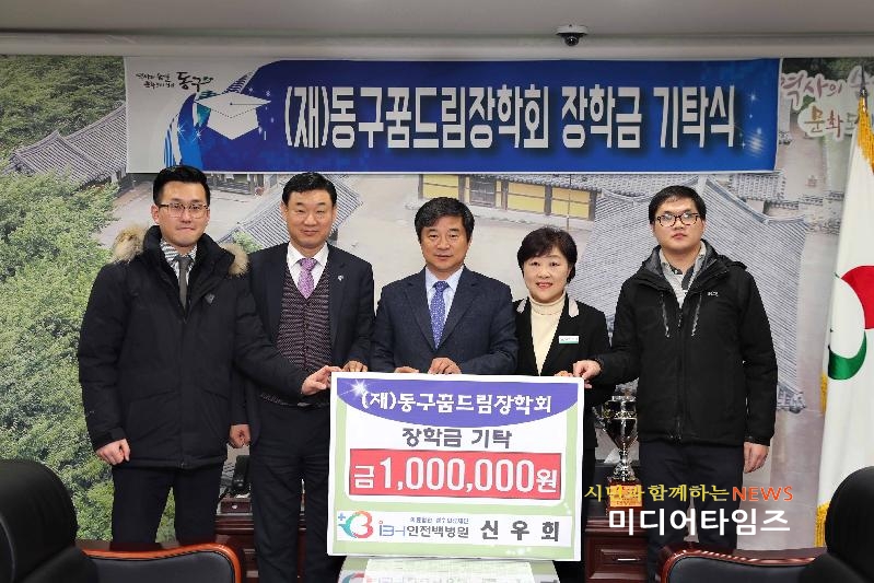 [미디어타임즈=문상수 기자] 인천 동구(구청장 이흥수)는 22일 오전11시경 인천백병원 신우회(회장 백승금)의 장학금 전달에 따른 기탁식을 개최했다.구에 따르면 이날 동구의 대표 병원인 인천백병원 신우회에서 1백만원을 전달했으며, 동구 학생들과 교육 발전을 위해 써달라는 뜻을 함께 전했다.기탁식에 참석한 기탁자들은 “관내 병원으로서 동구 교육여건이 변화되고 발전하는데 책임감을 느끼며, 이번에 기탁하는 장학금이 동구의 미래를 짊어질 학생들이 꿈을 이루는 데 작은 보탬이 되길 바란다”고 말했다.한편 이흥수 동구청장은 “어려운 경제상황에서도 동구의 학생들을 위해 장학금을 기탁해 주신 백병원 신우회 여러분들께 감사의 인사를 전한다”며 “동구꿈드림장학회의 장학사업을 통해 동구의 교육이 발전하는데 많은 관심을 가져 달라”고 말했다.
