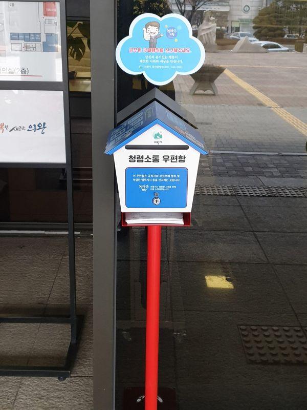 의왕시는 지난 19일 시민 눈높이에 맞는 청렴의왕 실현을 위해 ‘청렴·소통우편함’을 시청 본관 및 민원실, 레솔레파크 내 공원녹지과 건물 입구 등 3개소에 설치했다고 밝혔다.