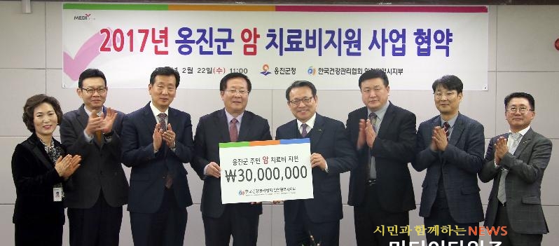 [미디어타임즈=문상수 기자] 옹진군(군수 조윤길)은 지난 22일 한국건강관리협회 인천광역시지부(본부장 이수배)와 지역주민 중 국가에서 지원을 받지 못하는 취약계층의 암 치료비 지원을 위한 협약을 체결했다. 국가암 치료비 지원대상(국가암 검진 후 5대 암 진단자, 의료급여수급자, 건강보험료 기준 적합자)에 포함되지 않지만 사실상 의료취약계층으로 암 발생 시 치료비로 경제적 어려움을 겪고 있는 주민들이 많아 옹진군은 지역주민의 삶의 질 향상을 위하여 2013년부터 이와같은 사업을 추진하였으며 2013년에서 2016년까지 총1억원7천4백5십만원(204명)의 의료비를 지원한 바 있다. 이번 협약으로 암 확진자에 한해 지원기준에 따라 3천만원의 예산범위에서 건강보험가입자 및 의료수급자에게 의료비(1인2백만원내)를 지원받을 수 있다. 옹진군 보건소 관계자는“암 치료비 지원뿐 아니라 2차 정밀검진, 기타 질병의 치료비 지원 등 옹진군 주민들을 위한 사후관리를 점차 확대하고 지속적으로 유지하기 위해 상호협력을 강화해 나갈 계획”이라고 말했다.