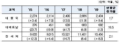 2019년 대중국·베트남 수출은 전년대비 각각 16.0%·0.8% 감소, 수입은 0.8%·6.6% 증가해 무역수지는 290억불·272억불 흑자를 기록했다.