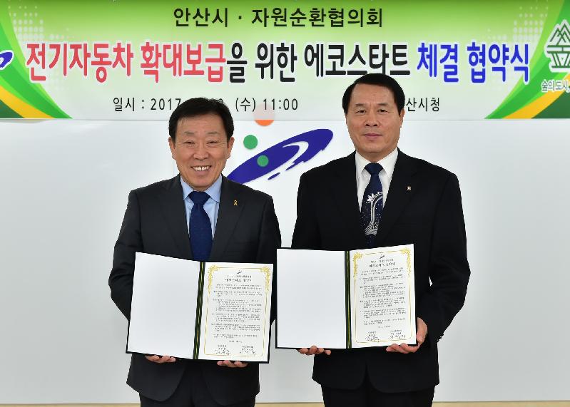 [미디어타임즈= 신정식 기자] 안산시(시장 제종길)와 자원순환협의회(의장 서성대)는 22일 오전 11시 30분 안산시청 제1회의실에서 전기자동차 확대보급을 위한 에코스타트 협약을 체결했다.