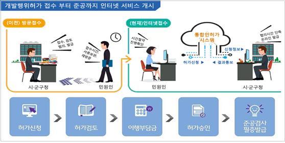 그동안 시·군·구청을 방문해 신청했던 개발행위허가 민원을 앞으로는 인터넷으로 신청해 처리결과를 조회하고 준공검사필증도 발급받을 수 있게 된다.