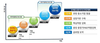 전라북도는 기업규모와 성장단계에 기초한 성장사다리 육성체계를 통해 단계적 기업지원을 해오고 있으며 실제 2019년 선도기업 79개사를 대상으로 실시한 성과분석 결과 최근 5년간 매출 연평균 8.51%, 수출 7.09%, 이익성장 1.05%, 고용 4.47%, 임금증가율 9.88%, 연구개발비 19.52% 증가 등 눈에 띄는 성장세를 보이고 있다.