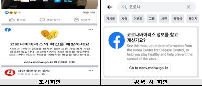 페이스북은 이용자들이 ‘코로나19, 코로나바이러스’ 등 관련 키워드를 검색할 경우 중앙사고수습본부의 코로나바이러스감염증19 홈페이지로 연계되도록 하고 2월 20일부터 초기화면 사용 중에 공지형태로 안내될 수 있도록 했다.
