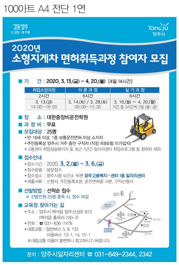 양주시일자리센터는 오는 3월 2일부터 ‘소형지게차 면허취득과정’ 수강생을 모집한다.