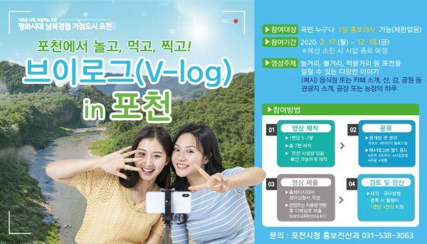 포천시는 올해 12월 18일까지 국민 누구나 포천의 먹을거리, 볼거리, 즐길 거리 등 포천을 알리는 브이로그를 공유하면 1편당 3만원 활동비를 지원한다.