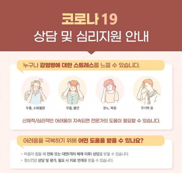 이번 심리지원은 확진자 및 가족, 격리 경험자들의 심리적 안정과 일상생활 복귀를 돕고 감염병에 대한 일반인들의 과도한 불안과 스트레스를 예방하기 위해 마련됐다.